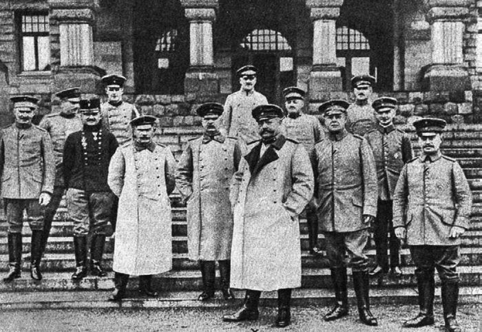 Главнокомандующий германскими войсками на русском фронте фельдмаршал Гинденбург со своим штабом. Слева его начальник штаба Людендорф