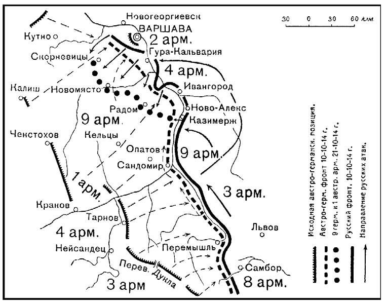 Германская армия, находившаяся уступом за северным крылом австрийцев, ожидала, что, преследуя австрийцев, мы втянемся в узкое пространство между Вислой и Карпатами или двинемся через Карпаты в Венгрию, чтобы броситься на наш открытый фланг и тыл. Но русское командование не повело свои армии в заготовленную западню. Тогда германцы сами перешли в наступление, являвшееся несвоевременным ни по численному составу германской армии, ни по состоянию австрийских войск, еще не оправившихся от галицийского поражения (см. схему).