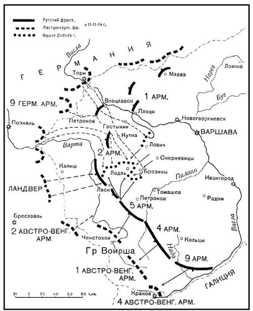 От Лодзи до Вислы установился непрерывный фронт. Попытка наша перейти в наступление против истощенной операцией 9‑й германской армии была остановлена переброской начавших прибывать в конце ноября – начале декабря 7 германских корпусов и германских кавалерийских дивизий с западного фронта. Переброска этой массы в один район и дружное ее вступление в бой легко могли сокрушить сильно расшатанный русский фронт; но мы повсюду действовали так активно, что Людендорфу пришлось вводить прибывавшие подкрепления по частям на различных участках фронта.