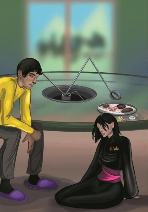 Из динамиков, встроенных под потолком по всему периметру трапезной, послышалась мелодичная, завораживающая музыка с множеством различных барабанов, вокальными подпевками и звуками зверей и птиц. Платье-кимоно, надетое Кариной под настроение, идеально гармонировало с музыкой. Уж кто-кто, а она умела объединить музыку или любой звуковой ряд с визуальным образом – это был ее скрытый талант. Свет в трапезной стал медленно меняться с густого ярко-желтого на слегка розовый с небольшой желтизной, и черное платье Карины словно ожило. Изображенное на всю спину солнце, прячущееся за морской гладью, превратилось в настоящий алый закат, а под ним поблескивали блики на волнах, будто вторя их движению. Спереди, на всю левую грудь был изображен какой-то иероглиф. Он был желтоватого цвета, но в новом свете он будто загорелся огненно-красным пламенем с желтым основанием. Это было очень красиво! В воздухе почувствовался приток свежего воздуха, несущий разнообразные еле уловимые ароматы каких-то диковинных цветов. Обстановка стала по-настоящему завораживающей и расслабляющей.