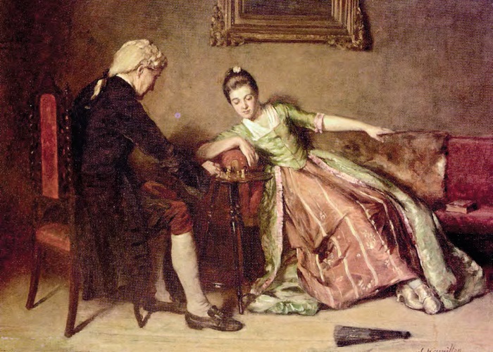 «Сперва расставим фигуры, – начала тетя со вздохом. – Здесь белые, там черные. Король и королева рядышком. Вот это – офицеры. Это – коньки. А это – пушки, по краям. Теперь…» Она вдруг замерла, держа фигуру на весу и глядя на дверь. «Постой, – сказала она беспокойно. – Я, кажется, забыла платок в столовой. Я сейчас приду». Она открыла дверь, но тотчас вернулась. «Пускай, – сказала она и опять села на свое место. – Нет, не расставляй без меня, ты напутаешь. Это называется – пешка. Теперь смотри, как они все двигаются. Конек, конечно, скачет». Лужин сидел на ковре, плечом касаясь ее колена, и глядел на ее руку в тонком платиновом браслете, которая поднимала и ставила фигуры. «Королева самая движущаяся», – сказал он с удовольствием и пальцем поправил фигуру, которая стояла не совсем посреди квадрата. «А едят они так, – говорила тетя. – Как будто, понимаешь, вытесняют. А пешки так: бочком. Когда можно взять короля, это называется шах; когда ему некуда сунуться, это – мат. Ты должен, значит, взять моего короля, а я твоего. Видишь, как это все долго объяснять. Может быть, в другой раз сыграем, а?» «Нет, сейчас», – сказал Лужин и вдруг поцеловал ее руку. «Ах ты, милый, – протянула тетя, – откуда такие нежности… Хороший ты все-таки мальчик». «Пожалуйста, будем играть», – сказал Лужин и, пройдя по ковру на коленках, стал так перед столиком. Но она вдруг поднялась с места, да так резко, что задела юбкой доску и смахнула несколько фигур. В дверях стоял его отец.