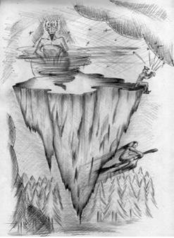 Взобрался он на дерево, что росло рядом с горой, и с его верхушки мягко опустился на площадку. Подошва перевёрнутой горы, на которой стоял солдат, представляла собой ровную каменную площадку саженей[2] сто в поперечнике. В центре раскинулось огромное многовековое кострище[3]. Вокруг кострища на несколько саженей камень почернел от огня. Во все стороны, насколько хватало глаз, расстилалось зелёное море – это верхушки деревьев волнами колыхались у его ног. Красота неописуемая! «Хороший наблюдательный пункт», – оценил солдат. Снизу старуха кричит:
