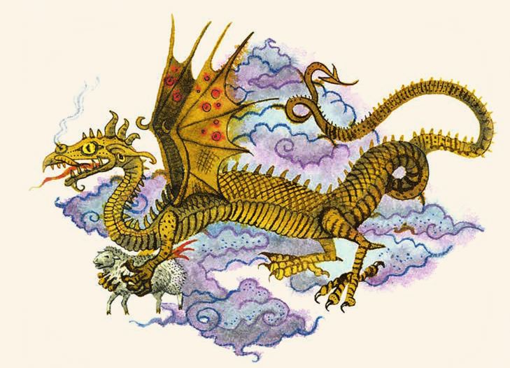 Залёг в ложбине, ждёт. Вот смерклось, раздался шум да треск, и появился среди туч ужасный крылатый змей! Ухватил он барашка, ухватил овечку, ухватил ягнёночка, в когтищах зажал. А потом давай овец доить. Добыл молока у семидесяти семи, бурдюки наполнил – и был таков. А молоко требовалось змею для его матушки-змеихи. Купалась старая, сморщенная змеиха в молоке, чтобы молодою да гладкою стать, и еженощно посылала сына на разбой.