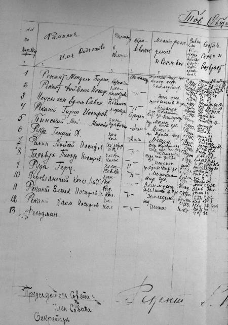На начальном этапе в товариществах состояли 44 семьи (всего 258 «едоков чисто еврейской национальности»). Социальный состав глав семейств, согласно отчетам, распределялся следующим образом: фабрично-заводских рабочих – 1, крестьян – 2, ремесленников-кустарей – 9, служащих интеллигентов 19, бывших торговцев – 13[83].