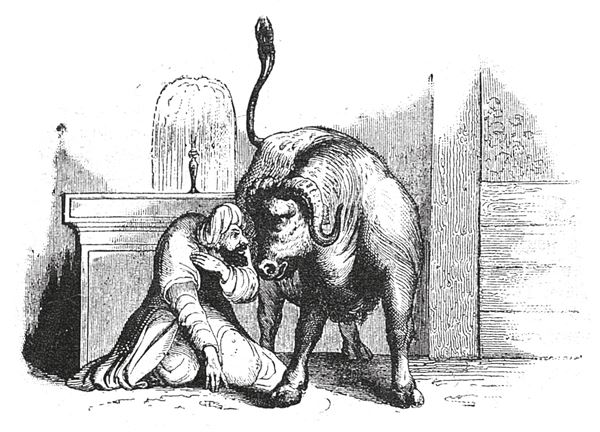 Но вдруг осел стал расти, сделался буйволом и, встав перед горбуном, заговорил как человек и сказал: