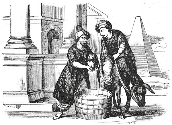 Я вошел в хан и позавтракал, а затем пошел собирать деньги за свои товары, после чего вернулся. Для жены своей я приготовил жареного барана и купил сластей. Позвав носильщика, я описал ему, как найти дом, и заплатил за труды. После этого я вплоть до заката солнца занимался своими делами, и когда явился погонщик с ослом, я взял пятьдесят червонцев и завернул их в платок. Войдя в дом, я увидал, что мрамор вымыт, а вся посуда вычищена как железная, так и медная, лампы заправлены, свечи зажжены, ужин подан и вино налито. Жена, увидав меня, обняла меня, и сказала: