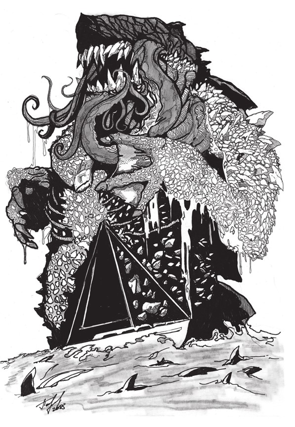Гигантская стена цунами до половины неба, и над ней – чудовищная зелёная тварь, настолько невозможная, что я чувствую, как кипят мозги и плавятся глаза. Под брюхом у неё болтается нечто инородное, словно колокольчик на шее динозавра. Я схожу с ума: мне кажется, что маленькое с этого расстояния белое пятно – корпус космического корабля, висящий на тросе.