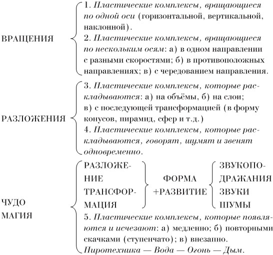 1. Абстрактный. – 2. Динамичный. Движение относительное (кинематограф) + движение абсолютное. – 3. Прозрачнейший. Для быстроты и летучести пластического комплекса, легчайшего и неосязаемого, который должен появляться и исчезать. – 4. Красочный и Светящийся (с встроенными лампами). – 5. Автономный, то есть похожий только на самого себя. – 6. Трансформируемый. – 7. Драматический. – 8. Летающий. – 9. Пахучий. – 10. Шумящий. Одновременно шумящий и пластически выразительный. – 11. Взрывной, появление и исчезновение со взрывами.