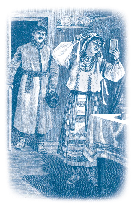 «Да, парубки, вам ли чета я? вы поглядите на меня, – продолжала хорошенькая кокетка, – как я плавно выступаю: у меня сорочка шита красным шелком. А какие ленты на голове! Вам век не увидать богаче галуна! Все это накупил мне отец мой для того, чтобы на мне женился самый лучший молодец на свете!» И, усмехнувшись, поворотилась она в другую сторону и увидела кузнеца…