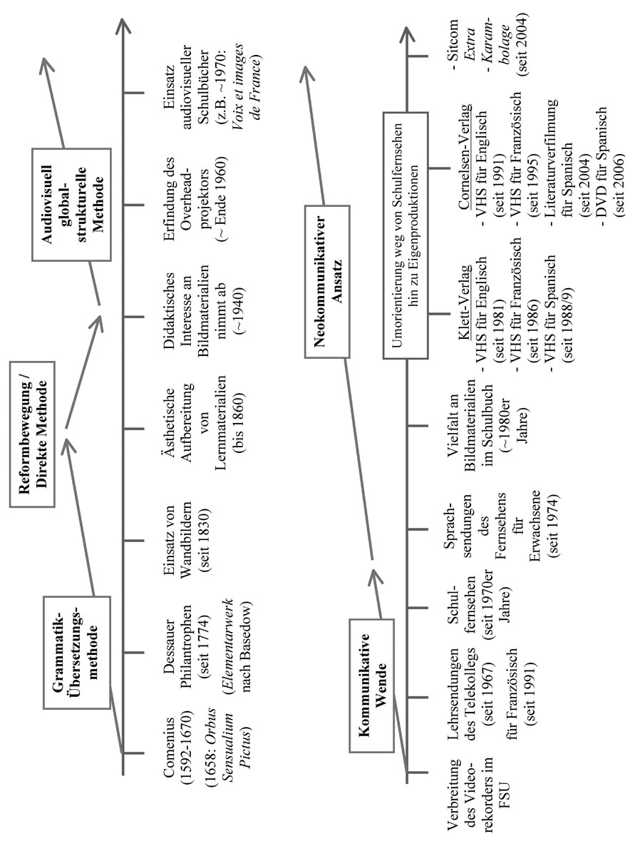 Eine Zusammenfassung der wichtigsten Ereignisse und unterrichtsrelevanter Publikationen kann Abbildung 3 entnommen werden. Die x-Achse dient als zeitliche Orientierung von den Anfängen Comenius’ bis hin zu den ersten fremdsprachlichen Lernvideos um die Jahrhundertwende. Die darüber liegenden Pfeile markieren dagegen die fremdsprachendidaktische Auf- und Abwertung (audio-)visueller Medien im Fremdsprachenunterricht. Sie stehen im Zeichen der sogenannten fünf großen Methoden der Fremdsprachendidaktik (Grammatik-Übersetzungsmethode, Reformbewegung/Direkte Methode, Audiovisuell global-strukturelle Methode, Kommunikativer Ansatz, Neokommunikativer Ansatz).