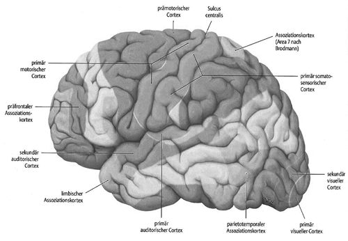 Abb. 4: Areale modalitätsspezifischer Verarbeitung im menschlichen Gehirn (Schünke/Schulte/Schumacher 2006, 378)