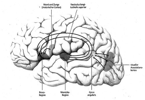 Neuroanatomischen Erkenntnissen zufolge geht man weiter davon aus, dass der Gyrus angularis „die Eingänge vom visuellen, akustischen und somatosensorischen Cortex [koordiniert] und […] die Wernicke-Region [beeinflusst]“ (Schünke/Schulte/Schumacher 2006, 381). Die Wernicke-Region ist für das Sprachverständnis zuständig und steht in direkter Verbindung zur Broca-Region, die für die Sprachproduktion verantwortlich ist. Beide Sprachzentren befinden sich normalerweise in der linken Hemisphäre des Gehirns und „sind durch den Fasciculus longitudinalis superior (=arcuatus) [sic] miteinander verbunden“ (ibid.) (cf. Abb. 5). Im Hinblick auf die Sprachverarbeitung geben aktuelle Studien zudem Hinweise darauf, dass sich die neuronale Aktivierung bei der Erst- (L1) und Zweitsprache (L2) teilweise voneinander unterscheidet. Dies gilt nach dem heutigen Kenntnisstand zwar nur für gewisse Teilfunktionen, könnte für die Schulung des fremdsprachlichen Hör-Seh-Verstehens aber dennoch von Bedeutung sein (cf. Mueller/Rüschemeyer/Friederici 2006, 182).