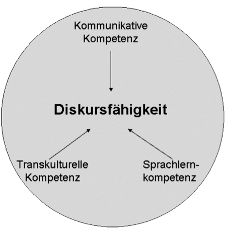 Ähnliche Formulierungen zu Gunsten eines integrativen Kompetenzerwerbs finden sich auch in den hessischen Kerncurricula wieder, wobei lediglich für die gymnasiale Oberstufe auf die Graphik der Bildungsstandards für die Allgemeine Hochschulreife rekurriert wird. Im Kerncurriculum der Sekundarstufe I wird das Zusammenwirken kommunikativer, transkultureller und Sprachlernkompetenzen dagegen anhand eines eigenen, hessischen Kompetenzmodells zur fremdsprachlichen Diskursfähigkeit (cf. Abb. 13) visualisiert. Die Text- und Medienkompetenz finden hierbei jedoch keine visuelle Berücksichtigung.