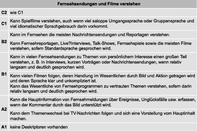 Folglich stellt sich die Frage, ob der Einsatz audiovisueller Medien zu Beginn des ersten Lernjahrs nicht vorgesehen ist oder ob Lernende trotz Nichtbeherrschens der Fremdsprache auf die Deskriptoren des Niveaus A1 nicht angewiesen sind. Sofern letzteres zutreffen sollte, müsste jedoch – ähnlich wie bei C2 – darauf verwiesen werden, dass für A1 und A2 die gleichen Deskriptoren gelten. Bekräftigt würde diese Interpretation durch die Annahme, dass Lernende durch den Rückgriff auf ihr Weltwissen bzw. ihre Hör-Seh-Erfahrungen im Umgang mit Filmen und Fernsehen befähigt sind, Hauptinhalte und Themenwechsel bei Fernsehsendungen allgemein zu erschließen. Fakt ist jedoch, dass der GeR die Verinnerlichung dieser Kompetenz erst Lernenden des Sprachniveaus A2 zuschreibt.