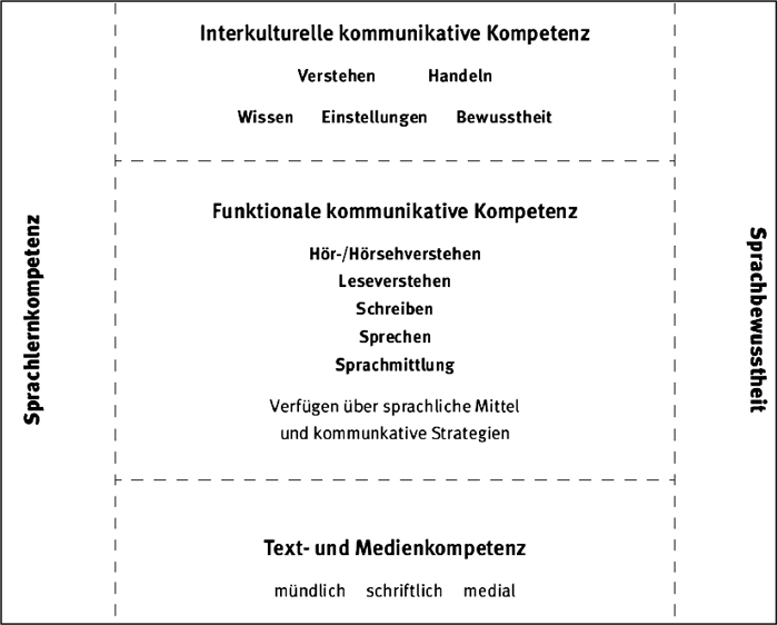 Die gestrichelte Linienführung macht deutlich, dass „alle abgebildeten Kompetenzen […] in engem Bezug zueinander“ stehen (ibid. 13). Die Kompetenz des Hör-Seh-Verstehens manifestiert sich in diesem Kontext insofern als integrative Teilfertigkeit des Sprachlernprozesses, als sie nicht nur in unmittelbarem Zusammenhang mit der Ausbildung sprachlicher und interkultureller Qualifikationen steht, sondern darüber hinaus „das Erkennen konventionalisierter, kulturspezifisch geprägter Charakteristika von Texten und Medien, die Verwendung dieser Charakteristika bei der Produktion eigener Texte sowie die Reflektion des individuellen Rezeptions- und Produktionsprozesses“ begünstigt (ibid. 20).