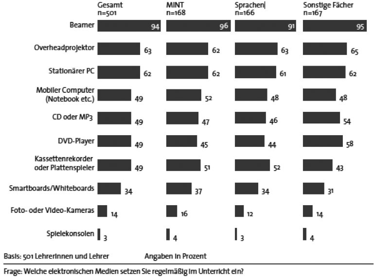 Obwohl Schulen verstärkt mit Informations- und Kommunikationstechnologien ausgestattet sind, kam eine weitere Bildungsstudie zu dem Schluss, dass „die Institution Schule […] nicht auf digitale Medien vorbereitet [ist]“ (Initiative D21 2011, 5). Es stellt sich also die Frage, warum der regelmäßige Einsatz elektronischer Medien trotz positiver Einstellung der Lehrer (cf. BITKOM 2011, 15) und verstärkter technischer Ausstattungen in deutschen Klassenzimmern nur relativ wenig Anwendung findet.