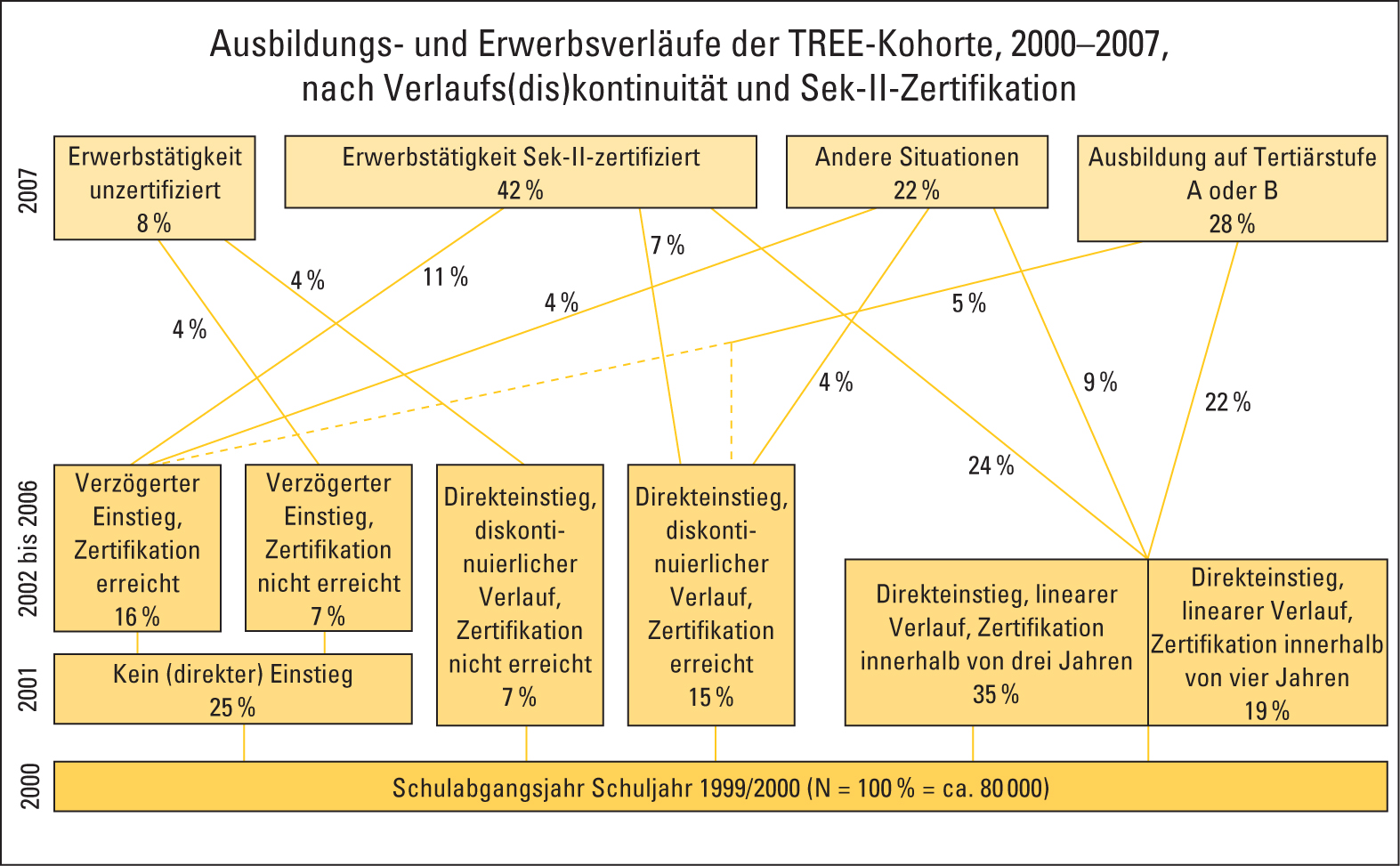 TREE zeigt zunächst, dass zwischen den Ausbildungsgängen, die das Bildungssystem formell vorsieht, und den tatsächlichen Ausbildungsverläufen der Jugendlichen eine große Kluft besteht: Nur gut die Hälfte aller Schulabgängerinnen und -abgänger bewältigen die erste Schwelle und die Sekundarstufe II so, wie es die Organigramme des Schweizer Bildungssystems vorsehen. Die Übergänge und Ausbildungsverläufe der anderen knappen Hälfte sind geprägt von Brüchen, Umwegen und Diskontinuitäten, zu denen auch der indirekte, verzögerte Einstieg in Sek-II-Ausbildungen über Zwischenlösungen bzw. Brückenangebote gehört (Keller, Hupka-Brunner & Meyer, 2010). Mehrere Analysen der TREE-Daten legen nahe, dass diese Brüche und Diskontinuitäten einen eigenständigen Risikofaktor für vorzeitigen Ausbildungsabbruch bilden.