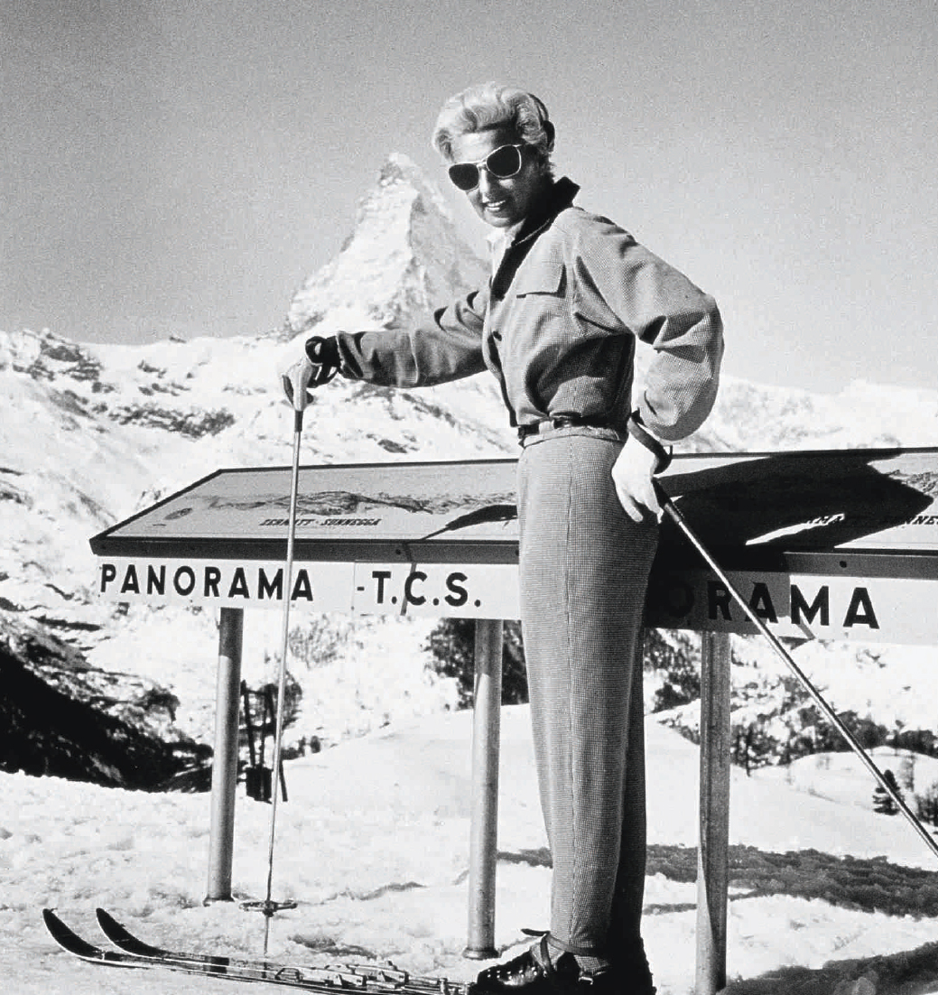 Das Matterhorn – eine tolle Kulisse für ein Bogner-Shooting, hier im Jahr 1954 mit Maria Bogner