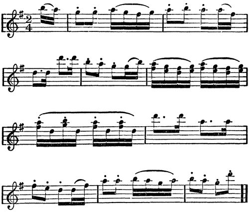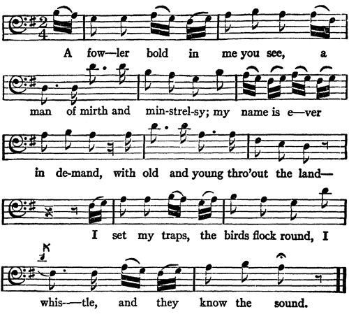 A fowler bold in me you see,A man of mirth and minstrelsy;My name is ever in demand,With old and young thro'out the land —I set my traps, the birds flock round,I whistle, and they know the sound.For wealth my lot I'd not resign,For every bird that flies is mine.I am a fowler, bold and free,A man of mirth and minstrelsy;My name is ever in demand,With old and young throughout the land.But nets to set for pretty maids:That were the most divine of trades.I'd keep them safe 'neath lock and key,And all I caught should be for me.