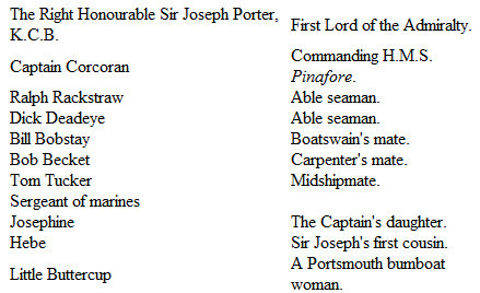 I know the value of a kindly chorus,But choruses yield little consolationWhen we have pain and sorrow, too, before us!I love, and love, alas! above my station.Which lets the cat out of the bag, at last! "He loves above his station!" Buttercup sighs, and pretty much the entire navy sighs. Those sailors are very sentimental chaps, very! – They are supposed to have a sweetheart in every port, though, to be sure, none of them are likely be above anybody's station. But their sighs are an encouragement to Ralph to tell all about his sweetheart, and he immediately does so. He sings rapturously of her appearance and of how unworthy he is. The crew nearly melts to tears during the recital. Just as Ralph has revealed that his love is Josephine, the Captain's daughter, and all the crew but Dick Deadeye are about to burst out weeping, the Captain puts in an appearance.