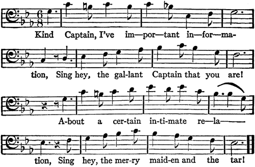 Kind Captain, I've important information,Sing hey, the gallant Captain that you are!About a certain intimate relation,Sing hey, the merry maiden and the tar!Kind Captain, your young lady is a-sighing,Sing, hey, the gallant Captain that you are!This very night with Rackstraw to be flying,Sing, hey, the merry maiden and the tar!