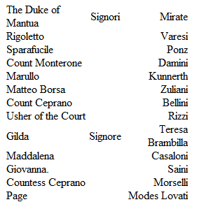 The story of the famous song "La Donna è Mobile," is as picturesque as Verdi himself. While the rehearsals of the opera were going on, Mirate, who sang the Duke, continued to complain that he hadn't the MS. of one of his songs. Verdi kept putting him off, till the evening before the orchestral rehearsal, when he brought forth the lines; but at the same time he demanded a promise that Mirate – nor indeed any of the singers – should not hum or whistle the air till it should be heard at the first performance. This signified Verdi's belief that the song would instantly become a universal favourite. The faith was justified. The whole country went "La Donna" mad.