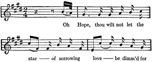 Oh Hope, thou wilt not let the star of sorrowing love be dimm'd for ever!Oh come, sweet Hope, show me the goal,However, however far forsake it will I never,forsake it will I never,forsake it I will never, etc.