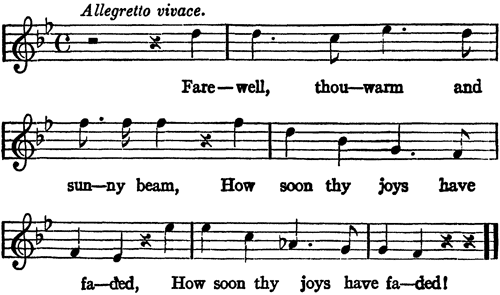 Farewell, thou warm and sunny beam,How soon thy joys have faded,How soon thy joys have faded!
