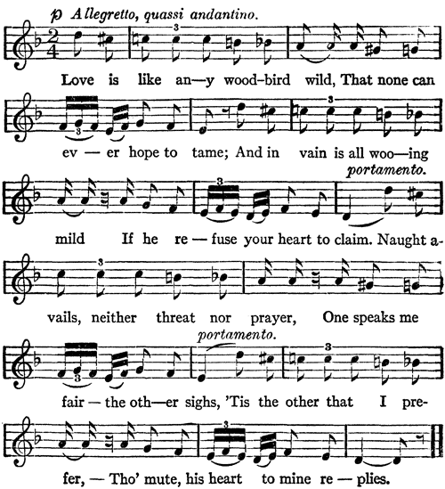 Love is like any wood-bird wild,That none can ever hope to tame;And in vain is all wooing mildIf he refuse your heart to claim.Naught avails, neither threat nor prayer,One speaks me fair – the other sighs,'Tis the other that I prefer,Tho' mute, his heart to mine replies.