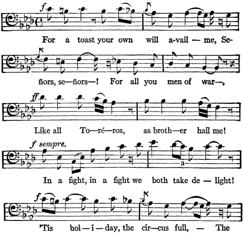 "Rah, rah, rah!" everybody yells, calling a toast to the bull-fighter, who is dressed up till he looks as fine as a little wagon. The toast suits him perfectly and he says so. He squares himself and strikes an attitude of grandeur without the least doubt that he is the greatest thing in the world, and while he is singing about it, half the people in the opera house are likely to agree with him. Here he goes: