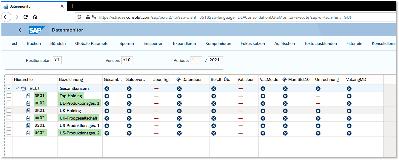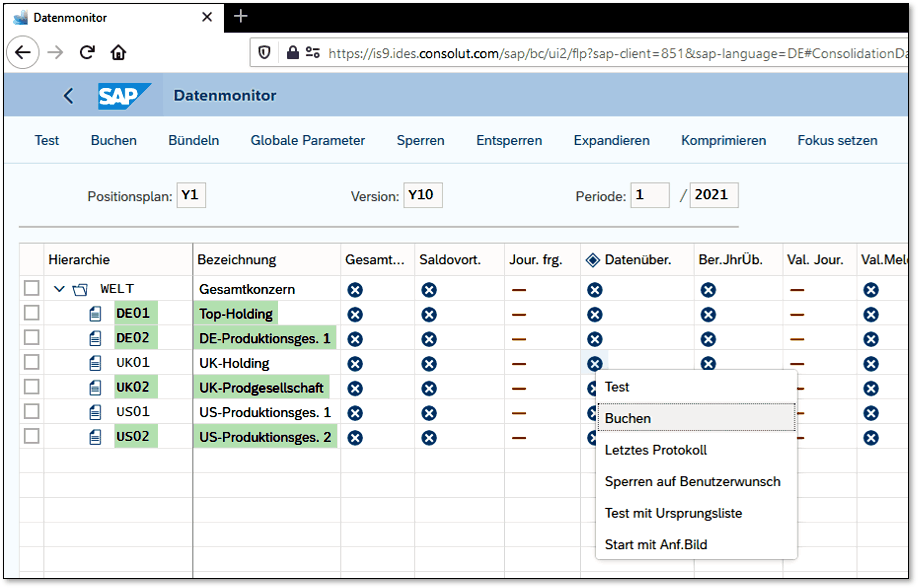 Grundsätzlich können Sie im Datenmonitor die Periode eines Geschäftsjahres auf Ebene der Konsolidierungseinheiten öffnen oder schließen. Darüber wird gesteuert, wann der Konsolidierungsprozess für eine Einheit starten kann bzw. wann der Abschlussprozess beendet ist. In dem Datenmonitor in Abbildung 3.2 ist die Buchungsperiode 1/2021 für die Konsolidierungseinheiten DE01, DE02, UK02 und US02 noch geschlossen. Daher sind diese Einheiten dunkler hinterlegt.