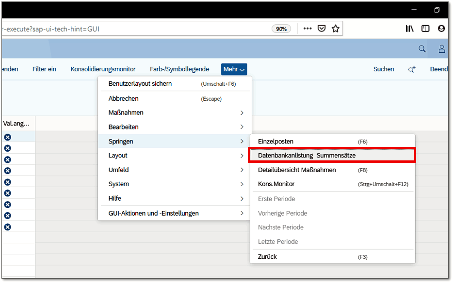 Sie können sich die Bewegungsdaten der Tabelle ACDOCU über die Fiori-App »Datenbankanlistung« (klassische Ansicht) anzeigen lassen. Dieses von den Konsolidierungsprodukten SAP EC-CS und SAP SEM-BCS übernommene Reporting-Werkzeug ist auch in die beiden Monitore integriert. Sowohl im Daten- als auch im Konsolidierungsmonitor gelangen Sie über den Menüeintrag Mehr • Springen • Datenbankanlistung Summensätze (siehe Abbildung 3.10) zur Datenbankanlistung.