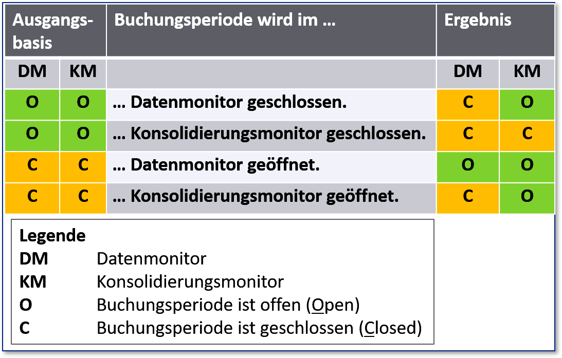 Die Periodenverwaltung existiert nicht nur im Daten-, sondern auch im Konsolidierungsmonitor. In Abbildung 3.6 sehen Sie, wie das Zusammenspiel der beiden Monitore mit der Periodenverwaltung funktioniert.