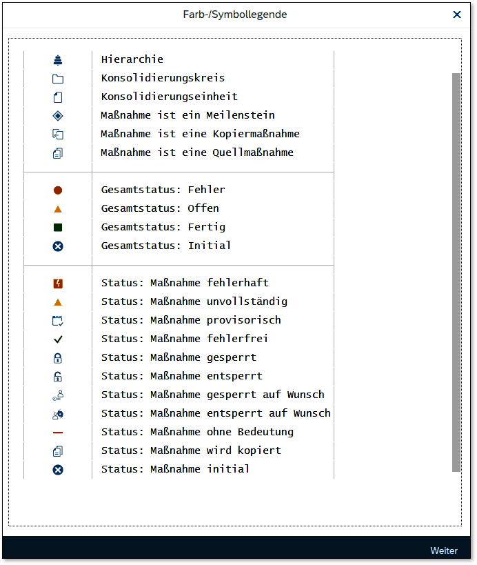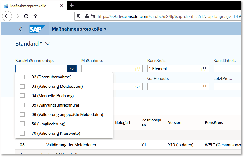 Ist der Status einer Maßnahme für eine bestimmte Konsolidierungseinheit initial, bedeutet das beispielsweise, dass diese Maßnahme für diese Konsolidierungseinheit noch nicht ausgeführt wurde. Erfolgreich absolvierte Maßnahmen können anschließend gesperrt werden. Sie haben dann den Status Gesperrt und sind nicht erneut durchführbar.