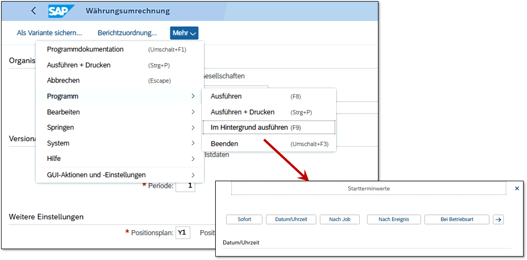 Den Modus Starten mit Anf.Bild können Sie z.B. verwenden, wenn Sie Maßnahmen während des Abschlussprozesses regelmäßig durchführen möchten. Dann bietet Ihnen dieser Modus die Möglichkeit, wiederkehrende Hintergrundjobs anzulegen. In Abbildung 3.5 sehen Sie beispielsweise den Selektionsbildschirm der Maßnahme Währungsumrechnung. Über den in der Abbildung gezeigten Menüeintrag Programm • Im Hintergrund ausführen können Sie die Startterminwerte für den Hintergrundjob festlegen.