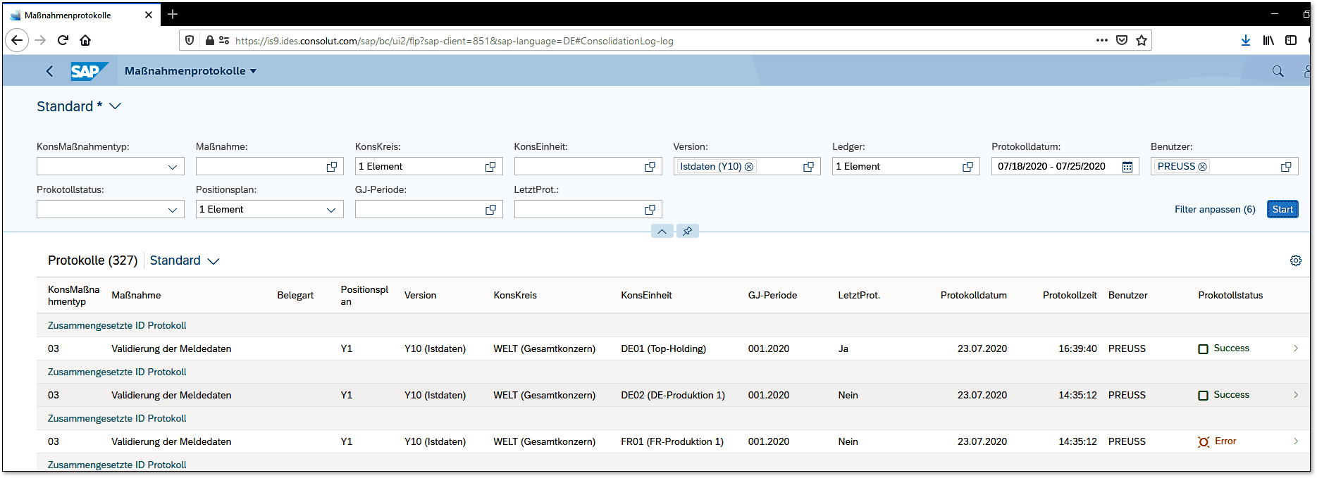 Jedes Mal, wenn Sie eine Konsolidierungsmaßnahme ausführen, wird ein Maßnahmenprotokoll erstellt. Abbildung 3.7 zeigt die Fiori-App »Maßnahmenprotokolle«, mit der die Protokolle der meisten Maßnahmen verwaltet werden. Hierüber können Sie dann u.a. die Belege analysieren, die von den Maßnahmen gebucht werden.