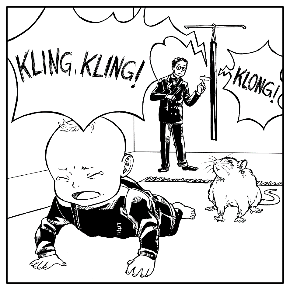 Der Versuchsaufbau des berühmten Experiments mit dem kleinen Albert. John B. Watson schlägt mit einem Hammer auf ein Metallrohr. Vor diesem Geräusch hat der kleine AlbertAlbert Angst. Nun wird dieses Geräusch mit dem Anblick einer weißen Ratte gepaart, so dass der kleine Albert lernt, Angst vor der weißen Ratte zu haben.