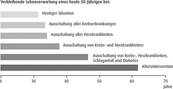 Auch die moderne Medizin ändert am Altersverlauf nichts. Sie ist darauf ausgelegt, Krankheiten zu bekämpfen, und beeinflusst daher die durchschnittliche Lebenserwartung in erster Linie über die Reduzierung vorzeitiger Todesfälle. Der Alterung selbst, aber auch degenerativen Alterskrankheiten, beugt sie nicht vor.