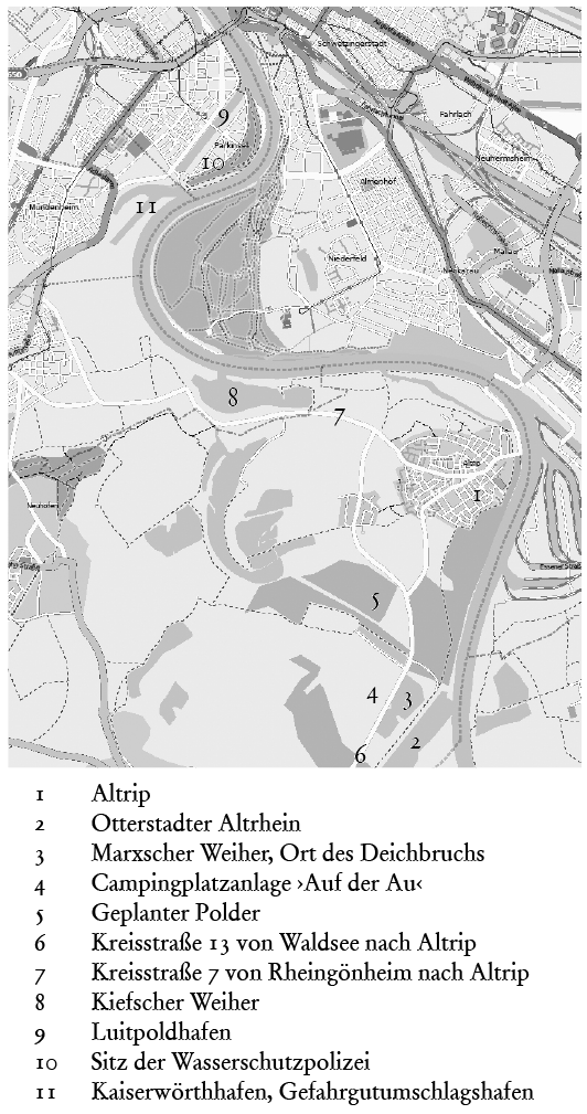 Jutta sprach weiter. »Dieser Deich ist an drei Stellen gebrochen. Das Rheinwasser strömt seit etwa einer Stunde direkt in das Gebiet des Marx’schen Weihers. Das Tragische dabei ist Folgendes: Durch Druckwasser hat der oberirdisch autarke Weiher nach ein paar Tagen annähernd den gleichen Wasserstand wie der Rhein. Aus diesem Grund sind seit drei Wochen die etwa 100 Campingplätze rund um den Marx’schen Weiher geräumt. Doch das reicht nicht mehr. Die K13, die den Marx’schen Weiher von der großen Campingplatzanlage trennt, liegt geringfügig tiefer als der Deich und ist in der Stabilität nicht mit einem solchen vergleichbar. Das bedeutet, bedingt durch den plötzlichen Wasserdruck, ist jederzeit damit zu rechnen, dass der Campingplatz mit seinen 3.600 Parzellen überschwemmt wird. Unsere erste Aufgabe ist daher, die Anlage zu evakuieren. Wir rechnen zu dieser Jahreszeit mit höchstens 1.000 Bewohnern. Allerdings werden einige dieser Zeitgenossen und auch die, die gerade nicht dort wohnen, versuchen, ihre Campingwagen in Sicherheit zu bringen. Sie werden unseren Rettungskräften die Evakuierungswege verstopfen. Es ist folglich mit aggressivem Verhalten zu rechnen. Ein Notlager für die Camper wird zurzeit in der Sommerfesthalle Waldsee errichtet, die technische Einsatzleitung wird bei uns in Schifferstadt installiert. Der Landrat als erster Ansprechpartner für Katastrophen-Notfälle hat dafür grünes Licht gegeben. Funk für alle beteiligten Dienste wird in einer Stunde zur Verfügung stehen, die Relais werden gerade geschaltet. Von der Situation an den Deichbruchstellen liegen uns keine verwertbaren Informationen vor. Ob es Verletzte gibt, wissen wir auch noch nicht. Es ist bei den momentanen Licht- und Wetterverhältnissen sehr schwierig, an die betreffenden Stellen zu kommen.«