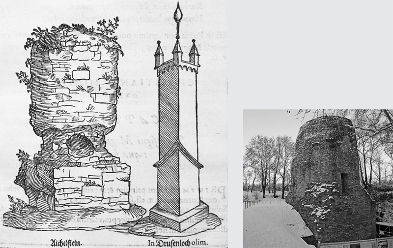 Wichtiger als Caesar erscheint in den an die Geschichte Roms anknüpfenden Ursprungsversionen von Mainz aus dem hohen Mittelalter aber der im gleichen Zug erwähnte Drusus, den die Überlieferung seit der Antike mit einem Grabmonument (Kenotaph) bei Mainz (Abb. 2) in Verbindung brachte.51 Bei Gozwin und dem sogenannten Sigehard ist Drusus der Stiefsohn des Augustus (i.e. Drusus d.Ä.), und unter der Herrschaft des Augustus begann gemäß der mittelalterlichen Lehre von den sechs Weltaltern mit Christus die letzte der universalgeschichtlichen aetates mundi. Drusus zählt in dem Legendenkomplex der Heiligen Alban, Aureus und Justina zu den ersten einer ganzen Reihe vornehmer (Gründer-)Gestalten (conditores et possessores) der römischen Kaiserzeit, die Mainz vorzuweisen habe.52 Er gilt als gleichsam zweiter Gründer der Stadt, der Mainz baulich erneuert habe.53 Demgegenüber wird im späteren, volkssprachigen Text vom „Ursprung der Stadt Mainz“ Wert darauf gelegt, dass keiser […] Trusus Mainz wertvolle Freiheitsprivilegien verliehen habe; zum Beweis wird neben Urkunden auf sein einstiges, hochaufragendes Grabdenkmal, das Trusenloch, hingewiesen, von dessen krönender, goldener Kugel die Stadt das Epitheton gulden Menz erhalten habe (vgl. Abb. 2).54 In jedem Fall vermehrte Drusus den verschiedenen Sagenüberlieferungen zufolge den Ruhm von Mainz, wie es am Ende des Mittelalters auch die bereits erwähnte, bekannte Schedel’sche Weltchronik zu vermelden weiß: Drusus […] hat das lob vnd den rům derselben stat clerlich gemeret55, und ein zeitgenössischer Historiograph fügte in Anbindung an die zitierte Legendenüberlieferung im oben erwähnten Sinn hinzu: „so dass man glauben konnte, die Stadt sei von Drusus sozusagen von Neuem errichtet“56.