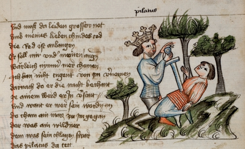 Hier hat die Geschichte noch einen anderen Charakter als bei Rothe. Ernst und gravitätisch klingt sie, gerichtet an ein gebildetes, und das hieß damals geistliches Publikum. Pilatus’ Vater ist auch nicht König Artus, den man in diesen Kreisen für ein Geschöpf unseriöser Unterhaltungsliteratur hielt, sondern ein Mainzer König mit Namen Tyrus. Auf einer Jagdpartie im Gebiet von Bamberg erkennt der nach Art seiner Standesgenossen in der Kunst der Astronomie ausgebildete Fürst am nächtlichen Himmel eine Sternkonstellation, die einem in jener Nacht empfangenen Kind Ruhm und Herrschaft verheißt. Da ihn seine Gattin nicht begleitet hat, lässt sich Tyrus durch seine Diener eine Frau zuführen, Pila, die Tochter des Müllers Atus, mit der er einen Sohn zeugt. Die Mutter gibt dem Kind den Namen Pilatus. Nach drei Jahren wird der Knabe an den Hof seines Vaters gebracht. Herangewachsen, tötet er aus Neid seinen Halbbruder, der ihm als legitimer Sohn des Königs in allen ritterlichen Wettkämpfen überlegen war (Abb. 1). Zur Strafe wird Pilatus von seinem Vater als Geisel nach Rom geschickt. Dort begeht er einen zweiten Mord: Wiederum aus Neid tötet er seine Mitgeisel Paginus, den Sohn des französischen Königs. Der Ermordete hatte Pilatus an höfischem Anstand und Ehre, moribus et honestate (Z. 37)7, weit übertroffen. Die Römer beschließen daraufhin, den Mörder auf die entlegene Insel Pontus zu entsenden, wo er entweder aufgrund seiner Bosheit die wilden und aufrührerischen Einwohner der römischen Herrschaft unterwerfen oder als verdiente Strafe den Tod finden soll. Pilatus gelingt es in der Tat, die Pontier zu bezwingen; aufgrund dieser Leistung erhält er den Beinamen Poncius (Z. 50). König Herodes, der von Pilatus’ Taten gehört hat, holt ihn als Mitregenten nach Judäa, wird aber nach kurzer Zeit von ihm entmachtet. Erst Prozess und Verurteilung Jesu von Nazareth, an denen Pilatus Herodes teilnehmen lässt, bringen die Versöhnung zwischen den beiden Widersachern. Eine ausführliche Darstellung der als bekannt vorausgesetzten Passionsereignisse hält der Erzähler nicht für nötig. Dennoch bilden sie die geheime Mitte der Pilatusvita. Denn da er sich mit der Verurteilung Christi nach mittelalterlicher Auffassung gegen Gott entschieden hatte, konnte der Richter Pilatus zum Frevler und Gottesfeind schlechthin werden, dem man ein Leben voller Untaten und Verbrechen zuschrieb.