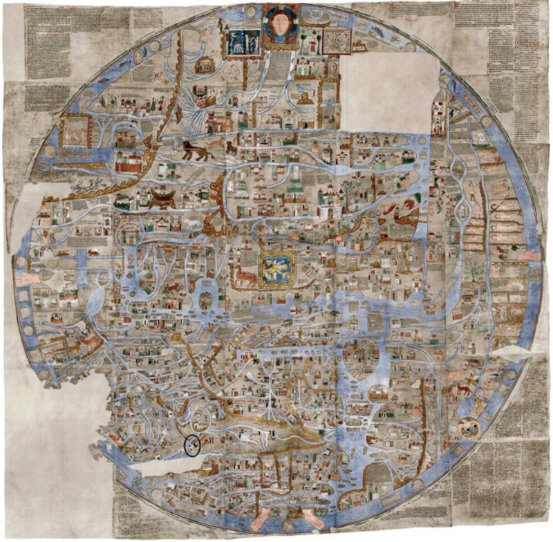 Abb. 2: Ebstorfer Weltkarte, ganz oben neben Christuskopf das Irdische Paradies, unten links in Markierung Mainz, um 1300 (Kloster Ebstorf).
