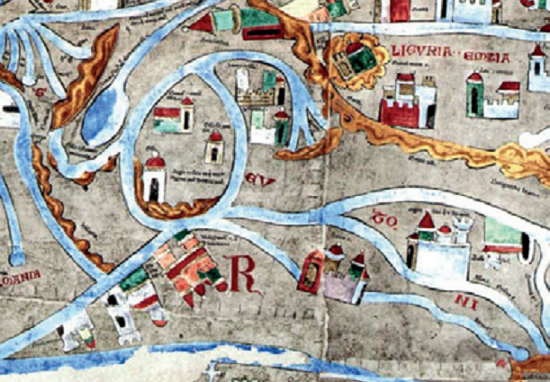 Abb. 3: Ebstorfer Weltkarte, Ausschnitt: unter der stark vergrößerten Insel Reichenau (im Wasser-Kreis mit drei Klosterzellen) entlang des Rheins Worms, Mainz (an der Mainmündung) und Koblenz; die Stadtvignetten stehen auf dem Kopf.