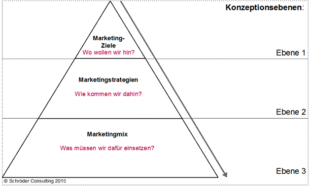 Eine Marketing-Konzeption kann aufgefasst werden als ein schlüssiger, ganzheitlicher Handlungsplan ("Fahrplan"), der sich an angestrebten Zielen ("Wunschorten") orientiert, für ihre Realisierung geeignete Strategien ("Route") wählt und auf ihrer Grundlage die adäquaten Marketinginstrumente ("Beförderungsmittel") festlegt.