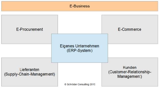 Das e-Business beinhaltet somit jede per Internet erfolgende Aktivität, innerhalb der Geschäftsbereiche Supply-Chain-Management (SCM) und Customer-Relationship-Management (CRM), gesteuert über ERP-Systeme. ERP (Enterprise Resource Planning)-Systeme sind kaufmännische Softwareprogramme, wie beispielsweise SAP. Diese Programme sorgen für die Verbindung der jeweiligen Schnittstellen und verhelfen bei korrekter Anwendung und Datenpflege für eine optimierte In- und Externe Unternehmenskommunikation.