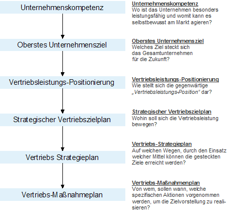 Für eine systematische strategische Vertriebssteuerung werden auf der Grundlage der Unternehmenskompetenz und in Ausrichtung auf das oberste Unternehmensziel nach einer vorangegangenen strategischen „Vertriebsleistungs-Positionierung“ herausfordernde strategische Vertriebsziele und erfolgreiche Vertriebsstrategien definiert und im Maßnahmenplan zur Umsetzung vorbereitet.