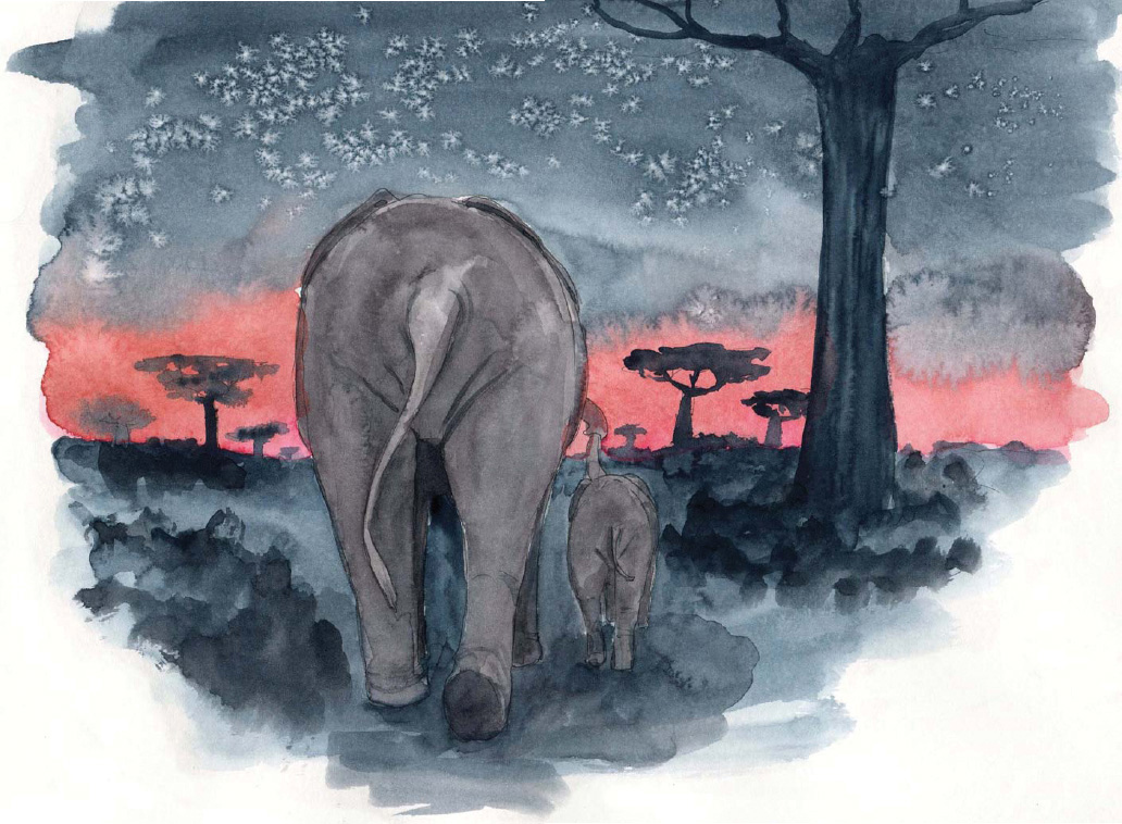 „Mum? Dad?“ Ololoo whispered as he felt the warmth of a body. Only it wasn’t the familiar greasy-sweet milk odour of his Mum’s belly. The sounds he heard were different. More like a gurgling, splashing, snorting. Not the familiar rumbling of old elephants.