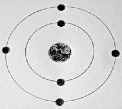 Hier sehen wir in der Mitte den Atomkern und außen zwei Elektronenbahnen mit 2 Elektronen auf der Innenbahn und 4 Elektronen auf der Außenbahn = Kohlenstoff.
