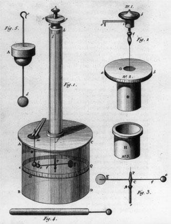 Die Coulombsche Drehwaage (1785) Figur 1: Das Instrument Figur 2: Die Aufhängung des Seidenfadens Figur 3: Die am Faden befestigte Querstange, am dem einen Ende eine Hohlkugel, am anderen ein kleiner Spiegel, der einen Lichtstrahl an eine außen angebrachte Skala wirft Figur 4: Vorrichtung zum elektrostatischen Aufladen der Kugel Figur 5: Gegenladung
