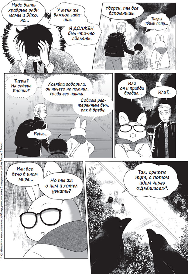 Этот участок реки обычно спокоен, но сегодня рядом и вовсе ни души – только несколько упитанных во́ронов прыгают по тропинкам в небольшом парке на северном берегу. Прекрасный погожий день перетекает в вечер, и тени на лесистом склоне реки, над которым простирается кладбище Дзёсигая, становятся длиннее и темнее. В дальнем углу ближайшего храма, поблескивая в сумерках, таится огромная скульптура головы тэнгу. Эти могучие ду́хи, хоть и не считаются ни злыми, ни добрыми, – известные похитители детей. Некоторые тэнгу принимают обличье человека с чертами хищной птицы, а другие, как эта скульптура, которую выносят во время праздничных шествий, отличаются красным лицом с огромным носом. За громадной головой в ожидании ежегодного парада выстроилось с десяток фигур поменьше – карасу-тэнгу, их называют во́ронами.